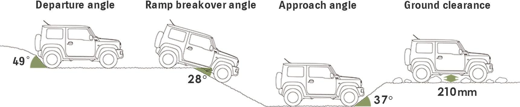 - Khoảng sáng gầm xe cao 210 mm. cho phép Jimny dễ dàng vượt qua các chướng ngại vật.