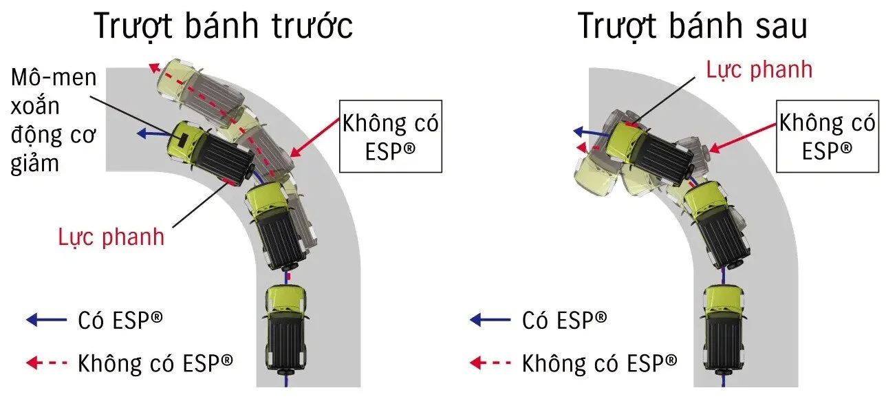 Khi phát hiện các bánh xe bị trượt, ESP® sẽ tự động điều chỉnh mô-men xoắn động cơ và áp dụng lực phanh để triệt tiêu hiện tượng bánh xe bị trượt và giúp người lái luôn kiểm soát được hướng di chuyển mong muốn.