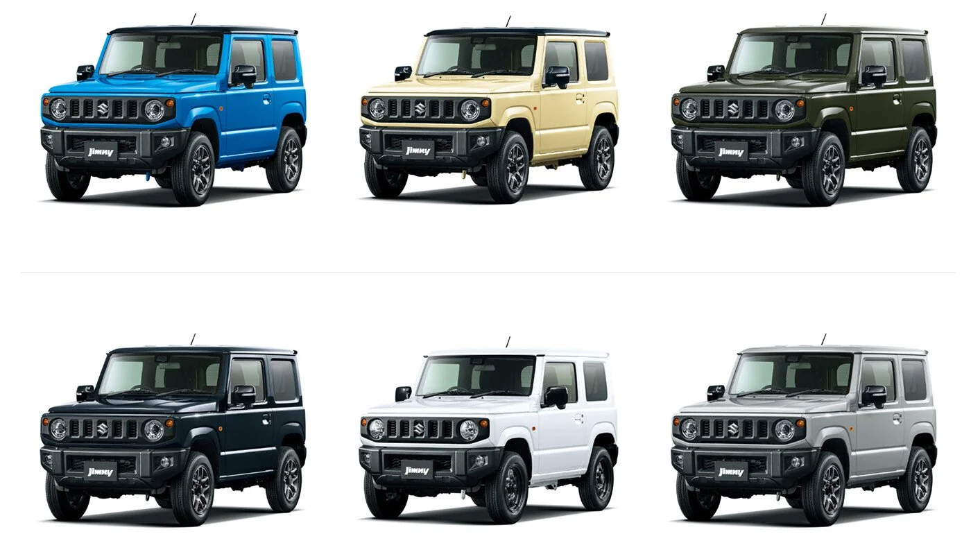 Suzuki Jimny sẽ có hai phiên bản tại Việt Nam: 1 tông màu và 2 tông màu được nhập khẩu nguyên chiếc từ Nhật Bản. Phiên bản 1 tông màu có những lựa chọn bao gồm trắng, bạc, đen, xám, trắng ngọc trai và xanh rêu. Phiên bản 2 tông màu có tùy chọn xanh-đen, vàng-đen và trắng ngà-đen.