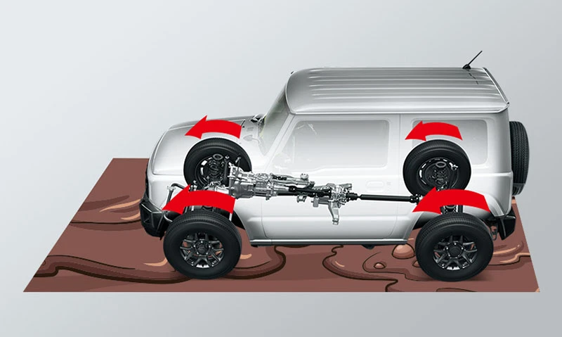 Ngay cả với hệ dẫn động 4WD bán thời gian kết nối trực tiếp bánh trước và bánh sau, nếu một trong các bánh bên trái và bên phải quay, bánh còn lại sẽ mất lực dẫn động. Để đảm bảo lực lái trong những cảnh quay như vậy, Jimny được trang bị phanh điều khiển điện tử LSD kiểm soát lực kéo như trang bị tiêu chuẩn. Khi trạng thái truyền động được chuyển sang 4L (4WD tốc độ thấp), hệ thống phanh chỉ tác dụng lên các bánh xe đang quay. Vì mô-men xoắn của động cơ không giảm nên lực dẫn động của bánh xe còn lại được đảm bảo chắc chắn và đạt được hiệu suất thoát cao.