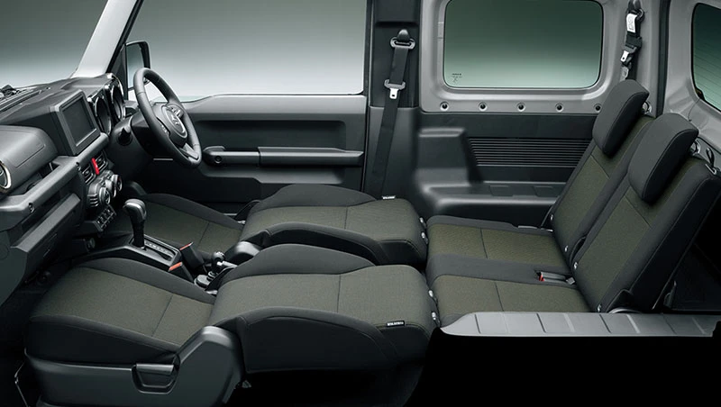 Nếu bạn gập hết hàng ghế trước về phía sau của Suzuki Jimny, chúng sẽ trở nên phẳng hoàn toàn và bạn có thể ngả lưng thoải mái trong xe. Bạn cũng có thể chất những đồ dài bằng cách gập hàng ghế sau.