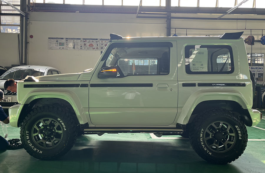Suzuki Jimny bản Comford lấy ý tưởng thiết kế hình bao diêm. Còn bản Comford+ được đánh giá là khá khỏe khoắn với bộ vành kim 15 inch. Bên cạnh đó, ốp gương màu đen cùng cửa sổ sau màu sẫm giúp làm nổi bật sự chắc chắn trên mọi cung đường. Tay nắm cửa được thiết kế cùng với màu sơn của thân xe. Đặc biệt, phiên bản này chỉ có tùy chọn về màu sơn với màu ánh kim.